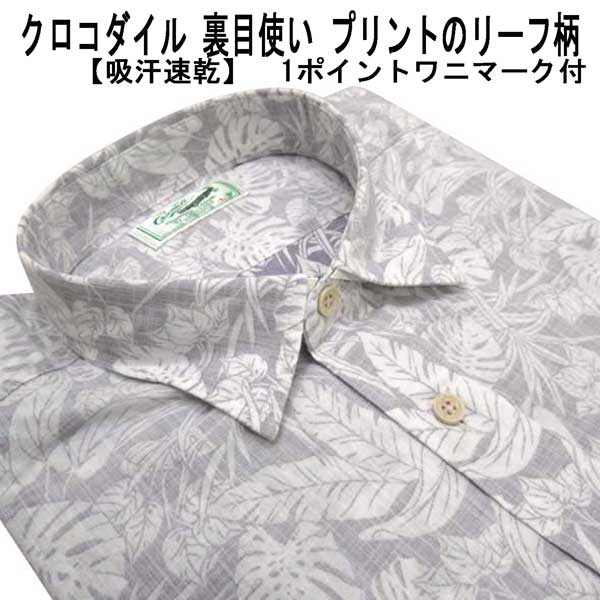 夏 クロコダイル 半袖シャツ 綿 1ポイントクロコダイルマーク付 裏目使い プリント リーフ柄 ライトグレー【M】【L】【LL】
