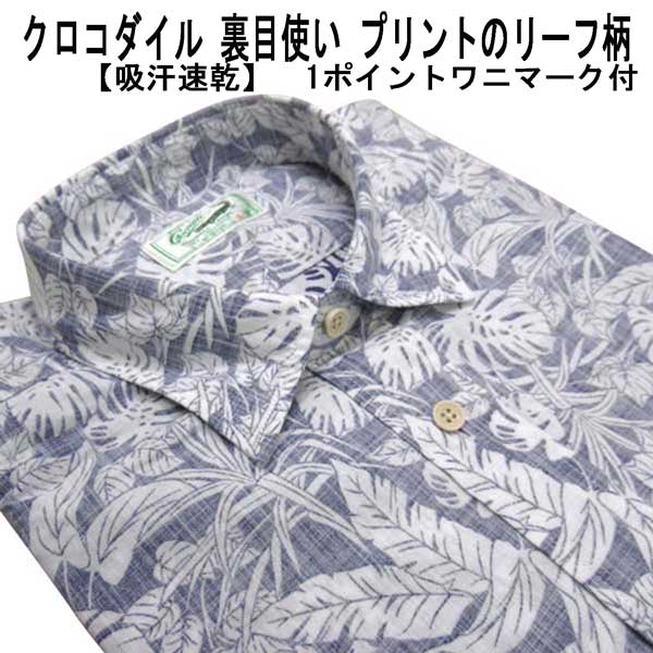 夏 クロコダイル 半袖シャツ 綿 1ポイントクロコダイルマーク付 裏目使い プリント リーフ柄 紺【M】【L】【LL】