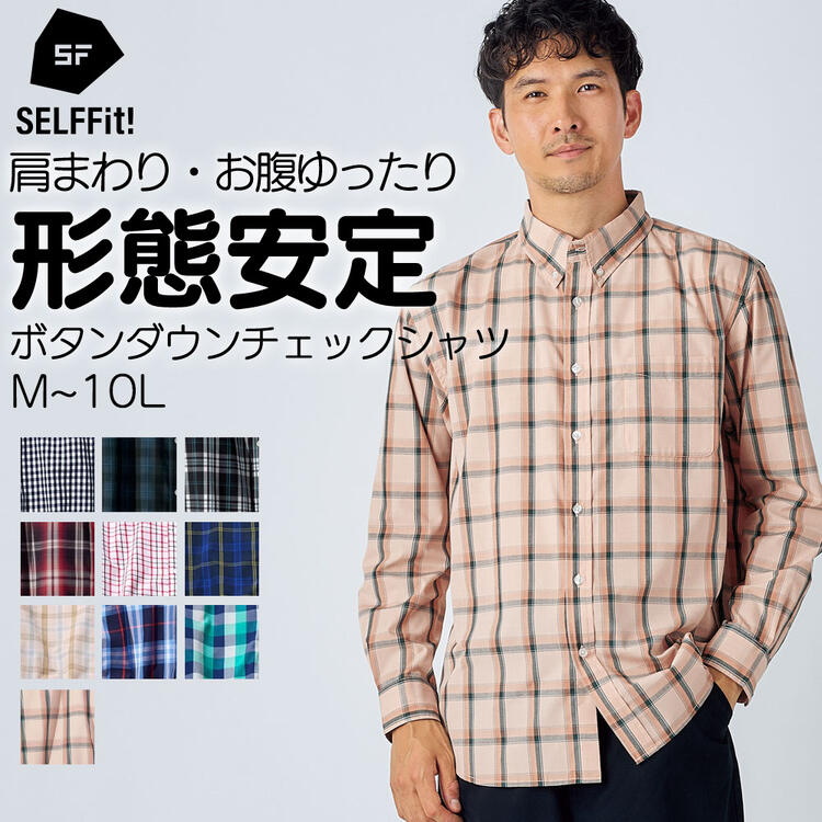 シャツ 長袖 形態安定 チェック柄 ボタンダウンシャツ 消臭テープ付 おなかぽっこりが気になる方へ! 肩まわりお腹ゆったり セルフフィット M-10L 大きいサイズ メンズ