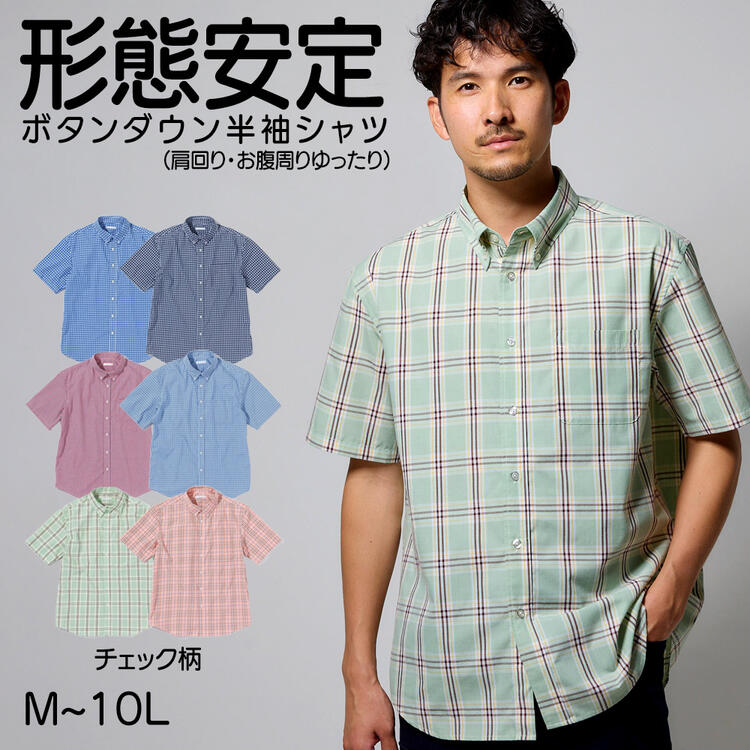 カジュアルシャツ 半袖 形態安定 チェック柄 ボタンダウン 肩まわりお腹ゆったり セルフフィット 消臭テープ付 すっきりシルエットに見せる! M-10L 大きいサイズ メンズ ニッセン