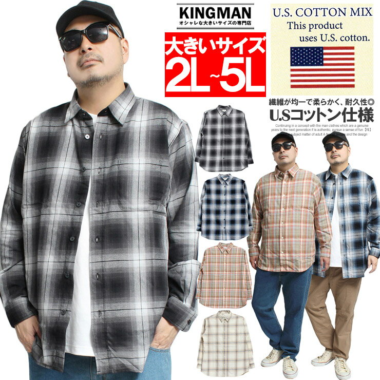 USAコットンを使用したを使用した長袖チェックシャツ チェックシャツ メンズ 大きいサイズ USAコットン ツイル 長袖シャツ カジュアルシャツ ⇒【KINGMAN推奨オススメのコーデパンツはコレ!!】 ⇒【KINGMAN推奨オススメのコーデパンツはコレ!!】 SPEC 説明 USAコットンを使用したを使用した長袖チェックシャツの登場です。 微起毛チェックのツイル素材で、春には白Tに軽くはおるも良し、ジャケットやブルゾンのインナーとして差し色にするもよし使い勝手のいいアイテムです。 トレンドに左右されないスタンダードなチェックシャツは、 カジュアルなスタイルに欠かせない1着。 どんなパンツにも合わせやすいカラーバリエーションで、ラフな雰囲気はデイリーからお出かけシーン、アウトドアにも活躍してくれます。 素材 綿100%(USAコットン混50%)片面微起毛チェック サイズ 2Lサイズ:着丈80cm 身幅64cm 肩幅53cm 袖丈80cm 3Lサイズ:着丈82cm 身幅67cm 肩幅55cm 袖丈82cm 4Lサイズ:着丈84cm 身幅70cm 肩幅57cm 袖丈84cm 5Lサイズ:着丈86cm 身幅73cm 肩幅59cm 袖丈86cm ご注意 ※ご注文頂いた実物とパソコンモニター画面では、見た目に多少の違いがあります。あらかじめご了承の上、お買い求め下さい。※ご注文が殺到した場合ズレが生じ、欠品となる場合があります。ご迷惑をお掛け致しますが、何卒ご了承下さいますようお願い致します。 ■モデル 着用サイズ身長体重 2L 183cm85kg