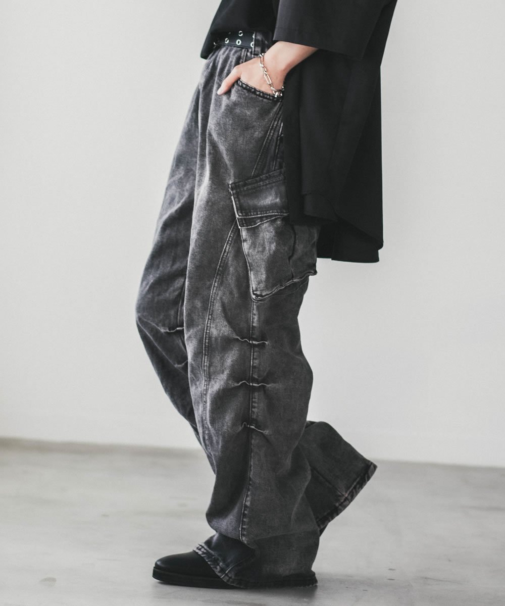 ▲送料無料▲ 【ケミカル加工デニムワイドカーゴパンツ】メンズパンツ デニムカーゴ ワイドカーゴ デニムパンツ カーゴ メンズ ワイド 色落ち ケミカル加工 イージーパンツ aa-2785