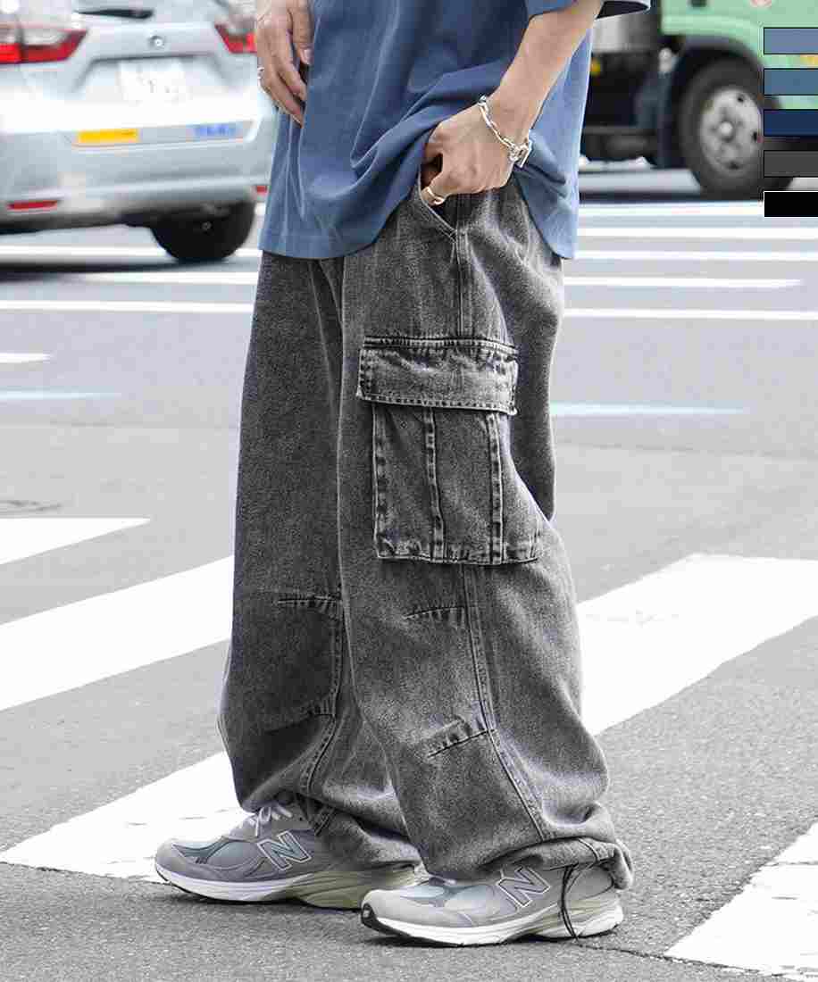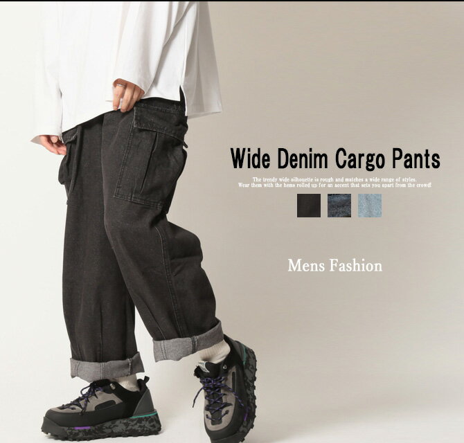 ワイドデニム カーゴパンツ メンズ ロールアップ ワイド デニムパンツ ジーパン