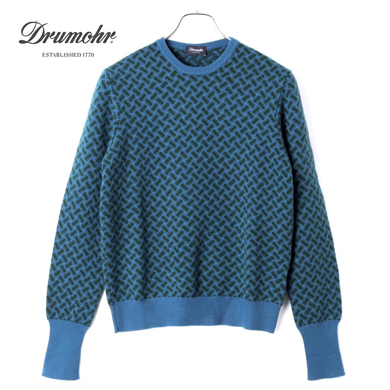 Drumohr / ドルモア|ビスコッティ柄カシミヤハイゲージクルーネックニット(D2K103)|(ブルー×ディープグリーン)| 秋冬 セーター ハイゲージニット カシミア メンズ イタリア アウトレット