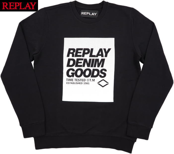 REPLAY/リプレイ M3218 REPLAY DENIM GOODS CREWNECK SWEATSHIRT スウェットシャツ/プリントトレーナー BLACK(ブラック)