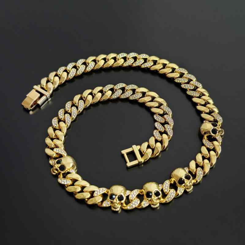 ネックレス メンズ スカル ドクロ ジルコニア 힙합 ヒップホップ ストリート 古巴 キューバチェーン アクセサリー ゴールド シルバー カラー 亜鉛合金 電気メッキ加工 個性 男女兼用