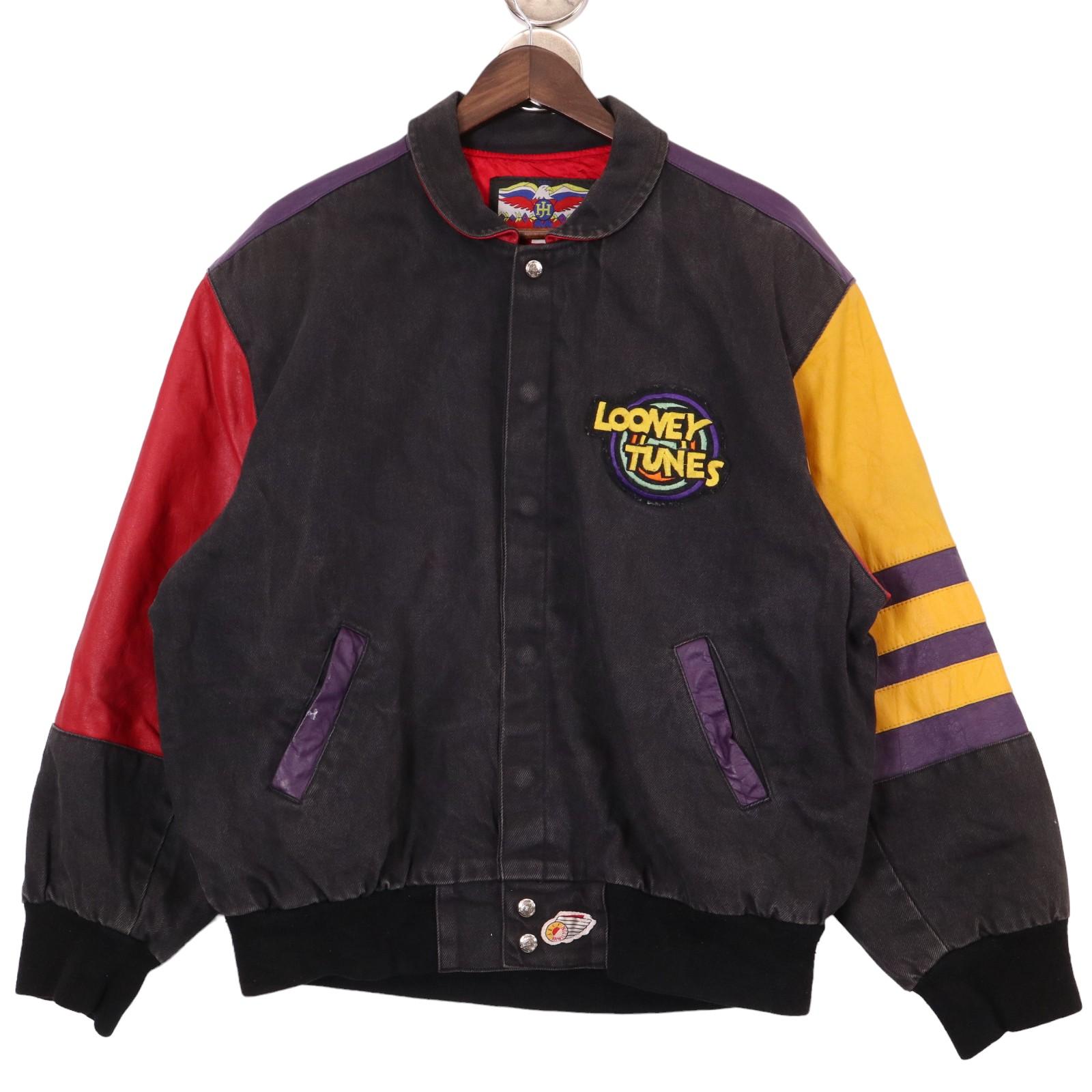 90年代 USA製 Jeff Hamilton ジェフ ハミルトン Looney Tunes スタジアムジャケット アメカジ ブラック (メンズ L) 中古 古着 A0278