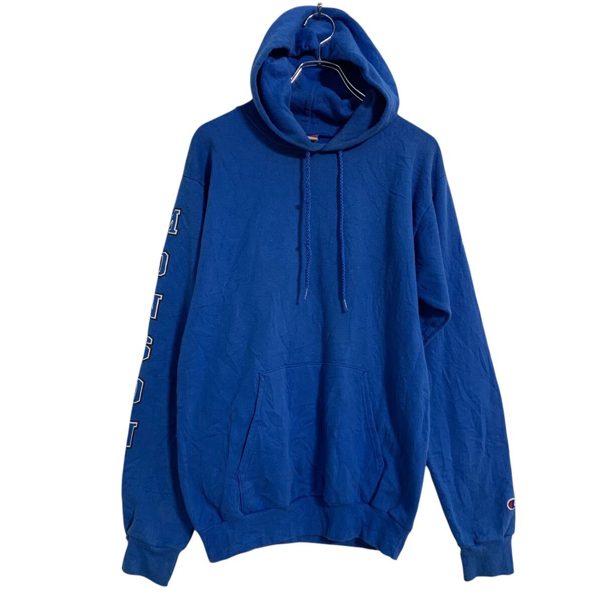 【中古】【古着】 Champion プリントスウェット パーカー ブルー S チャンピオン プルオーバー バックプリント サッカー 古着卸 アメリカ仕入 a701-6221