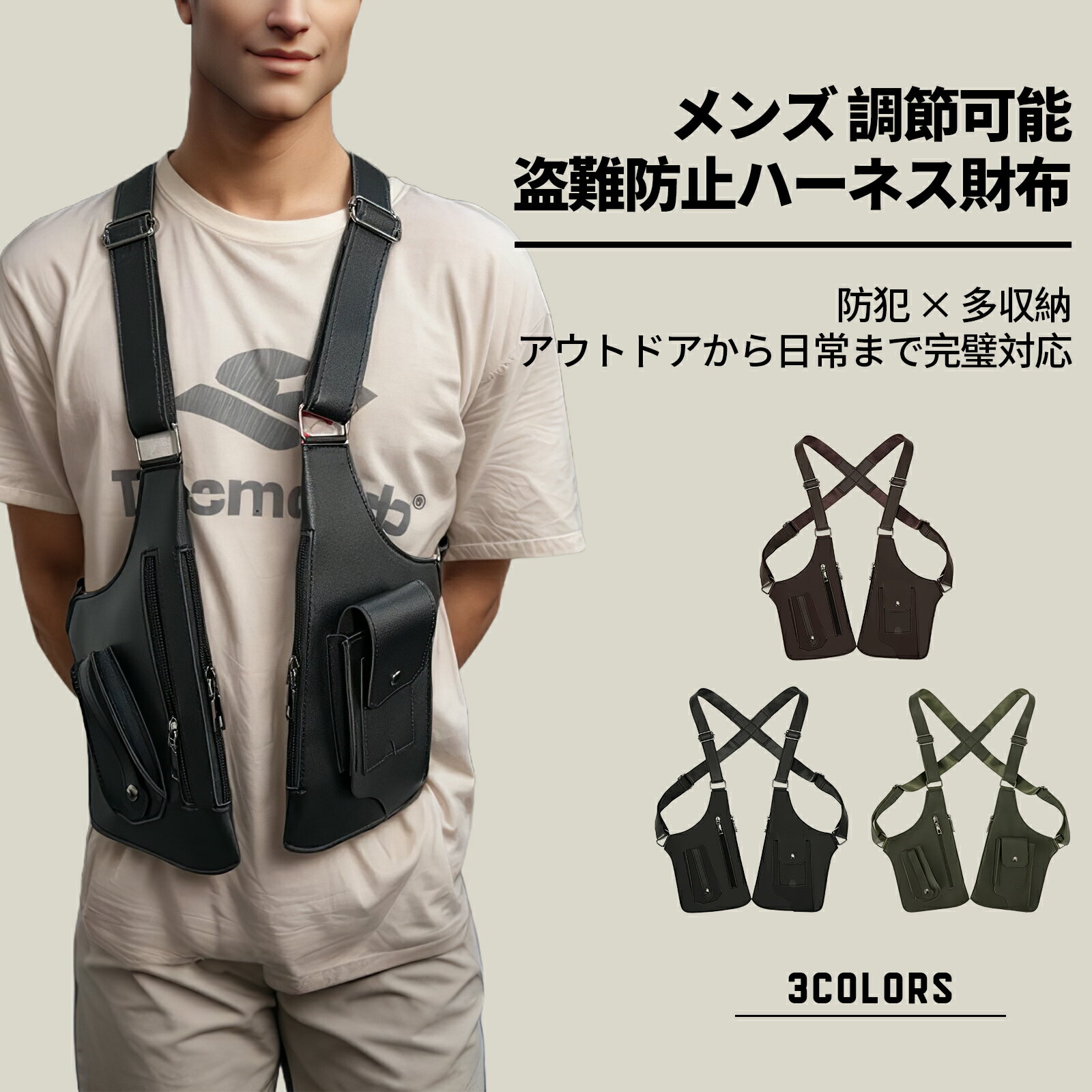 \Pポイント10倍/メンズ盗難防止ハーネス 防犯ハーネス セーフティハーネス レザーハーネス メタルバックル ダブルショルダー スチームパンク 防犯ウォレット 旅行防犯 アウトドア防犯 日常防犯 ビジネス防犯 スマホ収納 PUレザー 男女兼用 ジャケット対応 防犯グッズ