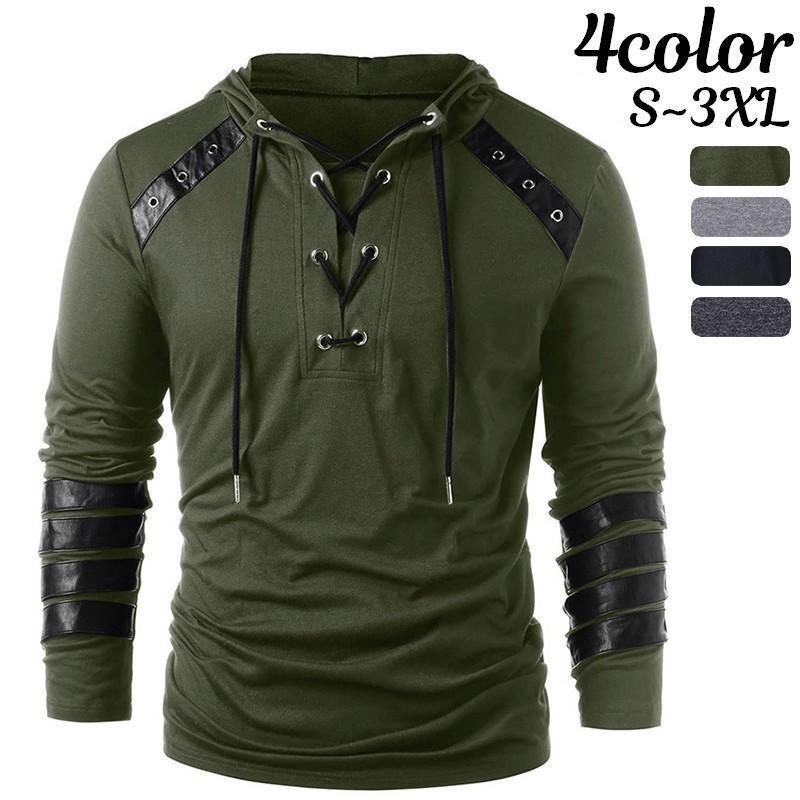 長袖カットソー Tシャツ ロングTシャツ メンズ 男性 長袖 フードつき フェイクレザーライン入り 無地 フロントレースアップ おしゃれ