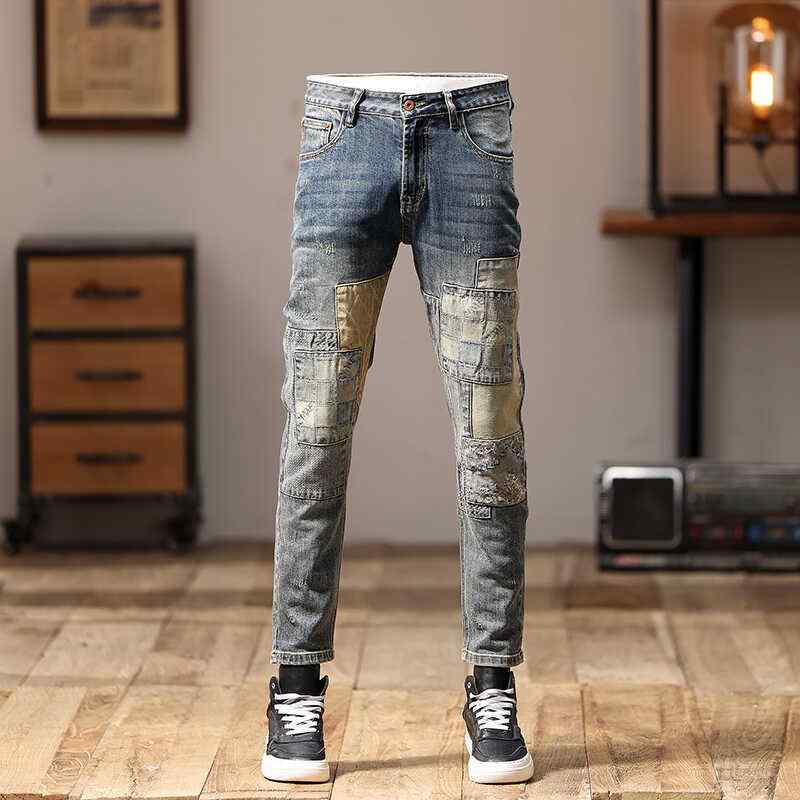 デニム パンツ メンズ ファッション 服 オシャレ シンプル 大人 かっこいい 大きいサイズ ストリート 紳士服 アメリカン レトロ ジーンズ パッチ スリムフィット ストレッチ 裾 パンツ