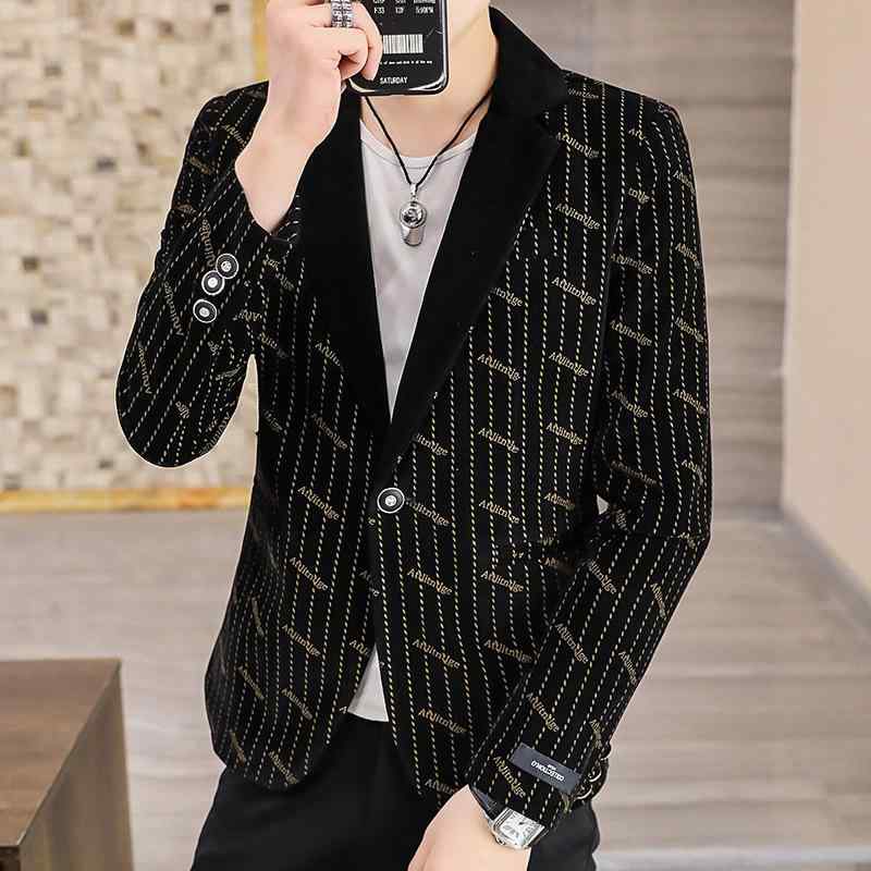 ・カテゴリ: カジュアルスーツ・性別: メンズ・スタイル: 韓国風・フィット: スリム・主な素材: ポリエステル100%・裏地素材: ポリエステル・ネックライン: テーラードカラー・フロント: シングルブレスト1つボタン・袖丈: 長袖・着丈: レギュラー丈・裾デザイン: ラウンドヘム・ベント: ノンベント・柄: ロゴ・デザイン詳細: ジャカード織り・ポケット: 玉縁ポケット・加工: 防しわ加工・着用シーン: カジュアル・カラー展開: グレー、ゴールド・サイズ展開: M、L、XL、XXL、XXXL