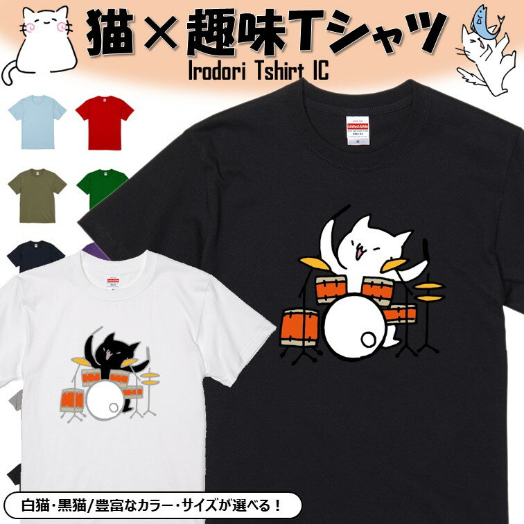 【長袖・ドライ有】 おもしろ趣味猫tシャツ 【ドラムを叩く猫】 おもしろ tシャツ 選べる イラスト 動物 猫 ねこ cat にゃんこ ネタ 文字 ネコ かわいい ゆるキャラ キッズ 子供 大人 ギフト プレゼント 名言 ウケ狙い 誕生日 白猫 黒猫 部屋着