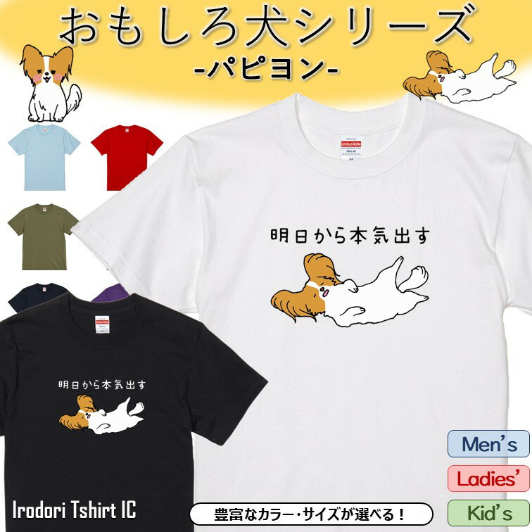 【長袖・ドライ有】 おもしろパピヨンTシャツ 【 明日から本気出す 】 おもしろ tシャツ 犬 パピヨン 動物 ペット アニマル ゆるい かわいい 部屋着 寝間着 キッズ 子供 ネタ 文字 イラスト デザイン メンズ レディース ギフト プレゼント