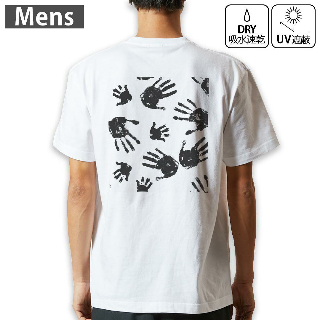 メンズ ドライバックプリントTシャツ ホワイト 半袖 4.1オンス ジム トレーニング スポーツ 運動会 ドライアスレチック UVカット 紫外線遮蔽 吸水速乾 デザイン Tshirt S M L XL 2XL 3XL 4XL 5XL 6XL 015781 手形 おばけ 白黒
