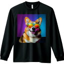 長袖Tシャツ 人間用 メンズ 秋春夏 プリント レジャー アウトドア カジュアル かわいい アート コーギー カラフル 可愛い 舌を出す 黒背景