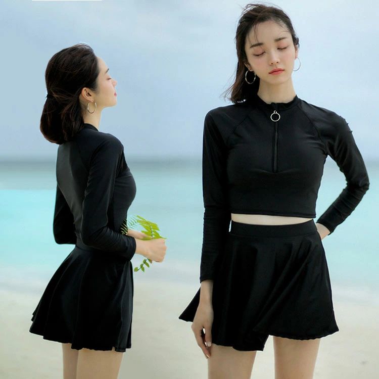 水着 レディース 長袖 ラッシュガード 2点セット 大人 フィットネス 体型カバー セパレート水着 スカート水着 おしゃれ 黒 無地 みずぎパッド付きトップス ボトムス 日焼け対策 紫外線対策 水着 フレアスカート水着 温泉 スイミング 海水浴 水遊び