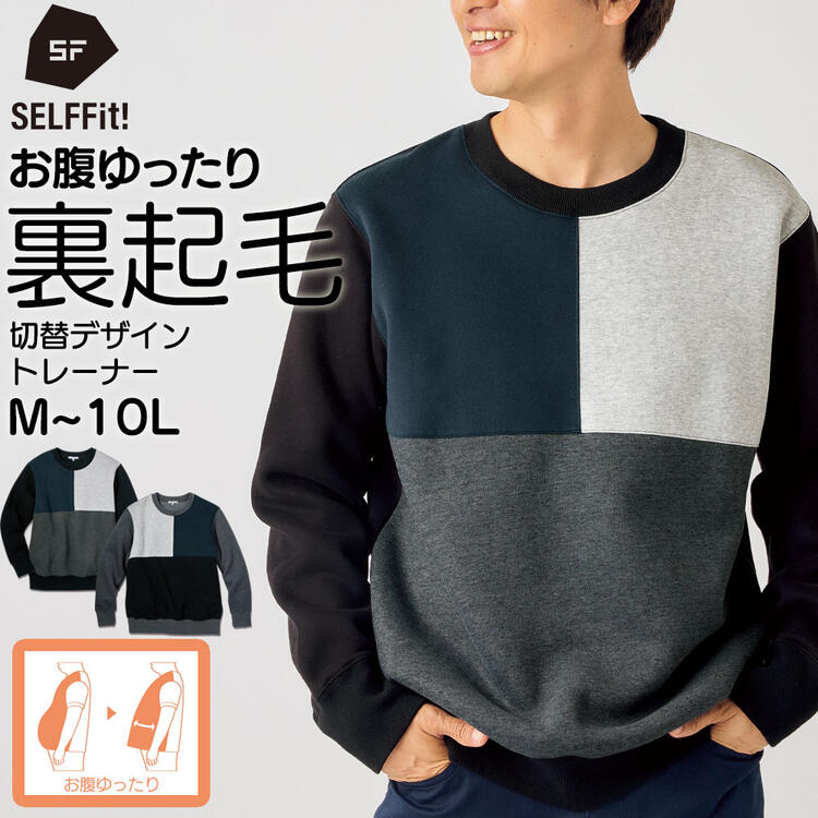 トップス 裏起毛 切替デザイントレーナー お腹ゆったり セルフフィット M-10L 大きいサイズ メンズ ニッセン nissen