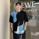 韓国 オーバーサイズ tシャツ ラグジュアリー カジュアル デニム 半袖 Tシャツ メンズ レトロ ゆったりトップス アシンメトリー ポケット おしゃれ 黒