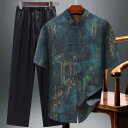 セットアップ シニア男性用 お父さん向け 中華風 チャイナ服風 半袖シャツ ジャガード織り 桑蚕シルク 絹素材 夏用 上下セット カジュアル リラックスウェア お手入れ簡単