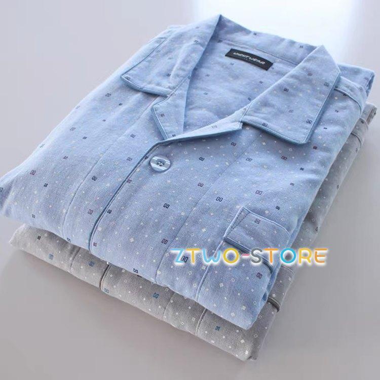 パジャマ メンズ 長袖 半袖 前開 上下セット メンズ 男の子 ドット柄 ガーゼ 肌に優しい 春秋 冬
