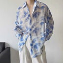シャツ メンズ 国潮スタイル 水墨画風 グラデーションプリント 薄手 シアー 長袖 ゆったり オーバーサイズ UVカット 前開き 羽織り ポリエステル 春秋物 カジュアル 青