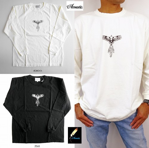 ACOUSTIC アコースティック Tシャツ メンズ ブランド 春 ロンTee 長袖 プリントTシャツ 厚手 丸胴 フェザー 羽根 デザイン カットソー クルーネック おしゃれ カジュアル アメカジ ルード バイカー ネイティブアメリカン ヴィンテージ ブラック グレー ホワイト (66-ac24401)