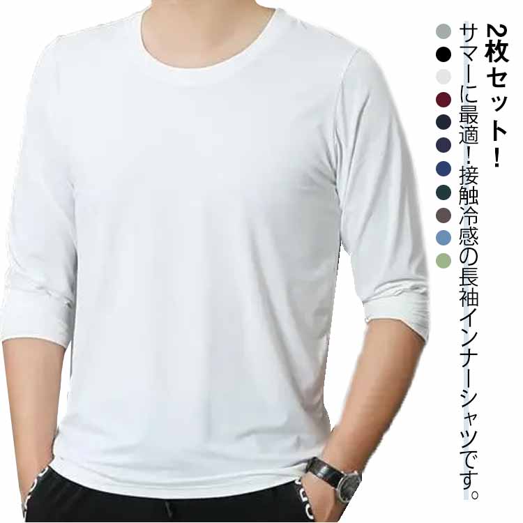 2枚セット tシャツ メンズ 夏 接触冷感 長袖 涼しい トップス アイスシルク 長袖tシャツ Tシャツ 薄手 ストレッチ 吸水速乾 丸首 インナーシャツ 作業服 作業着 トレーニングウェア ゴルフ 野球 大きいサイズ バイク 釣り キャンプ スポーツ 送料無料 S-5XL
