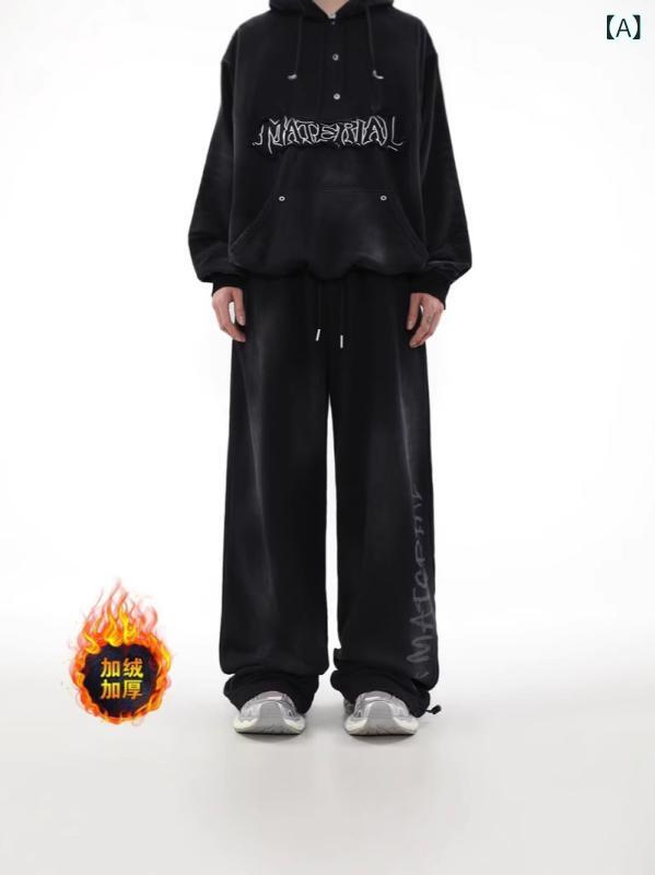 パンツ 男性用 レトロ ストリート 運動 ズボン 裏起毛 厚手 ブラック系 高腰 普段使い カジュアル 秋冬