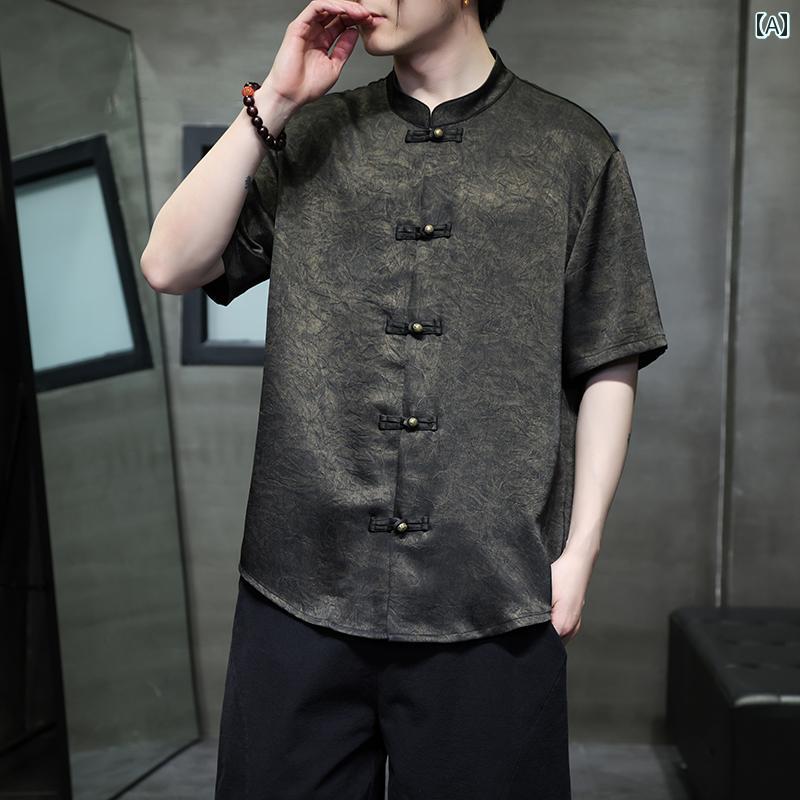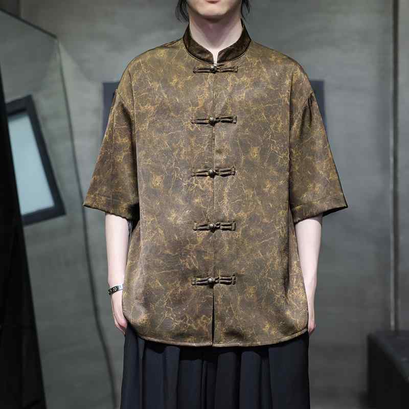 メンズ カンフー服 トップス シャツ チャイナ風 レトロ 文学 アセテート ブロンズ 唐 スーツ 半袖 中国 瞑想 ボタン