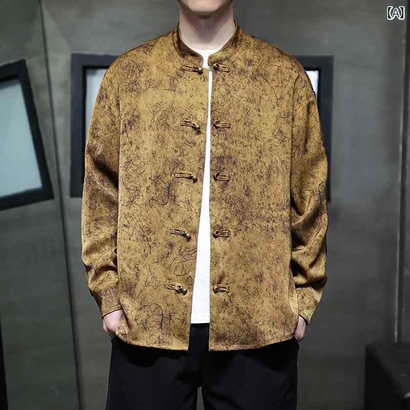 秋冬 コーデ メンズ 服 シンプル ファッション オシャレ 大人 かっこいい 大きいサイズ ストリート 紳士服 レトロ アセテート ブロンズ 唐 スーツ シャツ ボタン トップス
