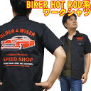 【M】【L】【XL】【XXL】【OLDER & WISER】(半袖)ビリー・エイト バイカー 刺繍ワークシャツ アメカジ メンズ 綿 黒 シャツ 刺しゅう バックプリント 大きいサイズ アメ車 旧車 ハーレー アメリカン ホットロッド ローライダー キャデラック Cadillac