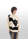 ニット レディース メンズ 猫柄 プルオーバー ゆったり 長袖 配色 ラウンドネック 杏色 黒 カジュアル 春秋