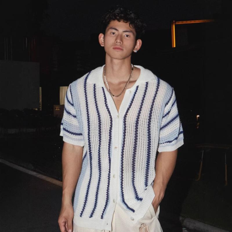 ニットシャツ メンズ ストライプ柄 透かし編み 夏ニット カーディガン 接触冷感 伸縮性 ブルー系 ポリエステル