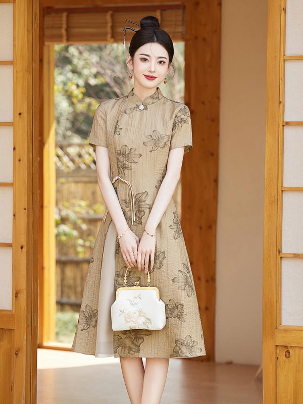 ・カテゴリ: ワンピース・スタイル: ベーシック・テイスト: レトロ・: 中国風・素材: プリント生地・主な素材: ポリエステル・加工: プリント・組み合わせ: 単品・着丈: ミディ丈・スカートシルエット: Aライン・ネックライン: スタンドカラー・袖タイプ: レギュラー・袖丈: 半袖・ウエスト: ハイウエスト・開閉部分: ファスナー・カラー展開: アプリコット、シャンパン・サイズ展開: M、L、XL、XXL