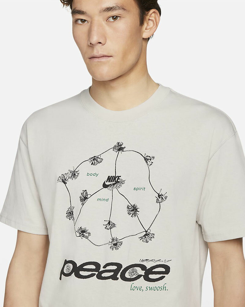 平和、愛、スウッシュの調和を表現した、地厚オーガニックコットンボディのグラフィックTシャツ。Max90のデザインでしっかりとした肌触りとゆったりとしたフィット感を実現しています。 <着用者想定寸法(cm)> 日本サイズ:胸囲/胴囲/身長 M:91〜97/78〜85/155〜176 L:97〜103/84〜91/176〜185 XL:103〜109/90〜97/176〜185 2XL:109〜115/96〜103/176〜185 <平置実寸(cm)> 日本サイズ:肩幅/袖丈/身幅/着丈 M:51/21/55/67 L:53/21/57/68 XL:55/22/60/69 2XL:58/22/63/70 <平置実寸の計測方法> 肩幅:左の肩先から右の肩先までを直線で計測。 袖丈:肩先の縫い目から袖先までを直線で計測。 身幅:左脇の下から右脇の下まで直線で計測。 着丈:後ろ衿付け根から裾まで(衿の高さは除外)。 <素材> コットン100% (オーガニックコットン繊維を75%以上使用) <製造> ナイキジャパン正規品 <エビデンス> メーカー希望小売価格はメーカー商品タグに基づいて掲載しています。 − brand −1971年、ギリシャ神話の女神ニケが由来の「NIKE」は、米国オレゴン州にてフィル・ナイトとビル・バウワーマンによって設立。世界的に有名な「Just Do It」スローガン、「スウッシュ」ロゴをアイコンに、革新的な技術を取り入れた新製品やスタイリッシュなファッションアイテム、アーカイブの復刻スニーカーなどを創出。アスリートからファッションフリークまで幅広い人から絶大な支持を受けています。知らぬ人のいないスポーツブランドの雄。NIKEのアイテムをみる*ナイキ 半袖Tシャツ メンズ S2 *