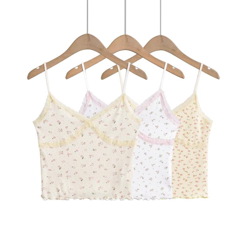 キャミソール トップス レディース 春夏 セクシーギャル ピュアセクシー アメリカン ショート丈 スリムフィット レースフリル 切り替え 小花柄プリント メロウ加工 ニット レーヨン 伸縮性 バックオープン