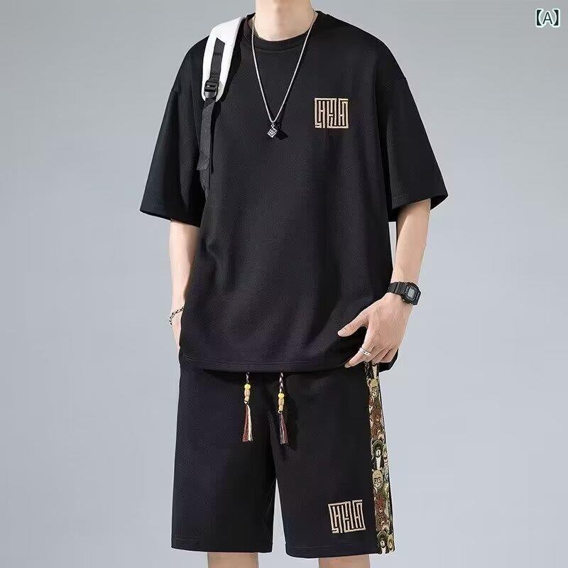 ・カテゴリ: メンズカジュアルセットアップ・スタイル: スポーツ・厚さ: 薄手・パンツ丈: 5分丈・トップススタイル: Tシャツ・トップス袖丈: 半袖・カラー展開: ブラック、ホワイト、グリーン、アプリコット、グレー・サイズ展開: M、L、XL、2XL、3XL、4XL、5XL