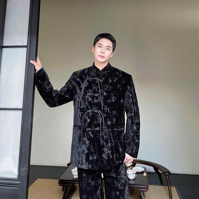 秋 チャイナ風 スタンドカラー ジャケット ボトム セットアップ セット 起毛 プリーツ ジャカード レトロ バックル メンズ