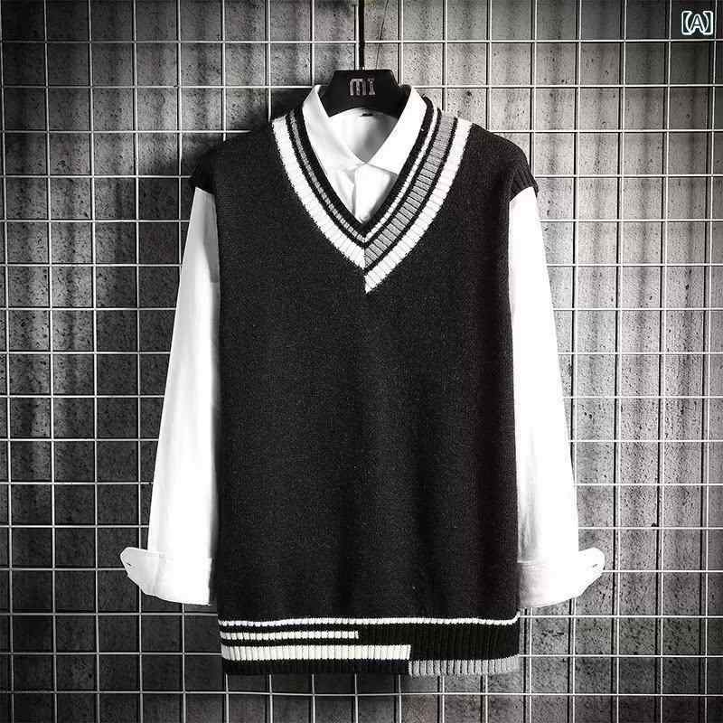 ニットベスト メンズ レディース Vネック ノースリーブ スクール風 学院風 重ね着 秋 冬 厚手 ポリエステル カジュアル おしゃれ トレンド ジレ 配色 普段使い 通学 黒 灰 緑