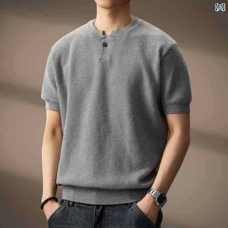 サマーニット 半袖ニット シンプル ハイエンド 軽い 大人 シンプル ヘンリー 襟 ニット 半袖 Tシャツ メンズ 夏 スリム カジュアル レイヤリング シャツ 薄手 ポロシャツ