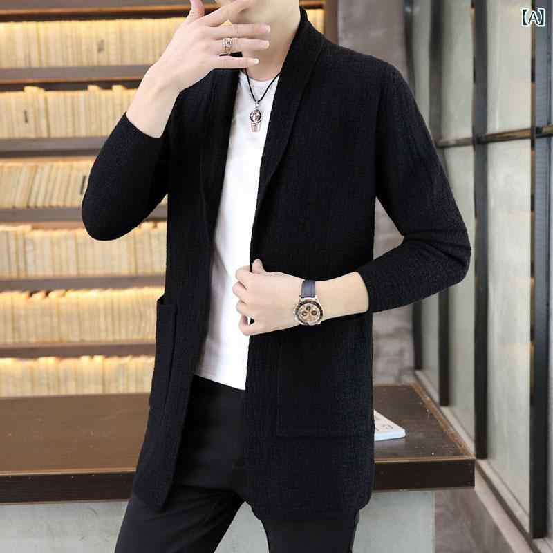 ニット カーディガン メンズ 中長丈 単色 ラペル 長袖 カジュアル ジャケット 春秋 ポリエステル 混紡 スリムフィット ポケット 直裾 黒 深灰 青年 レジャー 修身 免烫 立体 貼袋
