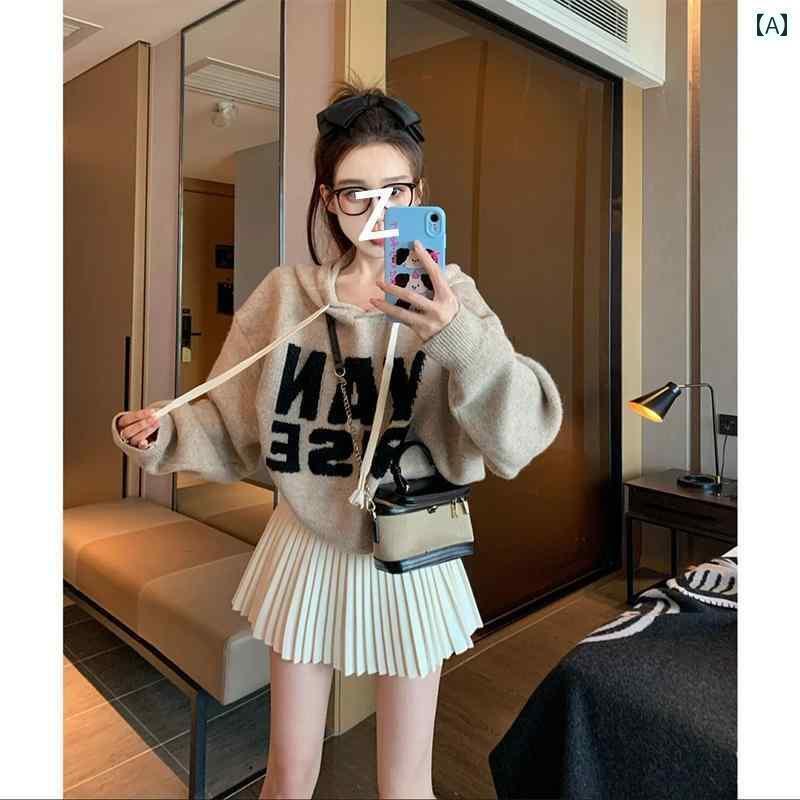 トップス ジャケット カジュアル レディース 春の な 衣装 2025 ゆったりした フード付き レター ニット セーター ホワイト ショート スカート ツーピース スーツ