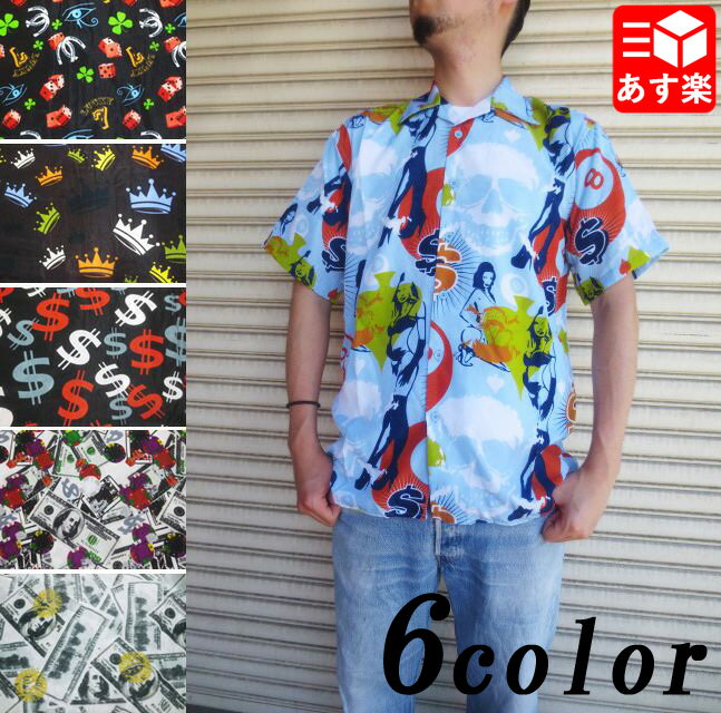 FERUGINI 開襟 総柄 ポリエステルシャツ 半袖 6カラー サイズ:S, M, L, XL, 2XL, 3XL, 4XL, 5XL 8ボール・スカル柄、ダイス柄、王冠柄、$柄、ギャンブル柄、マネー柄【ハワイアンシャツ】【新品】 新品 mellow 【古着 mellow楽天市場店