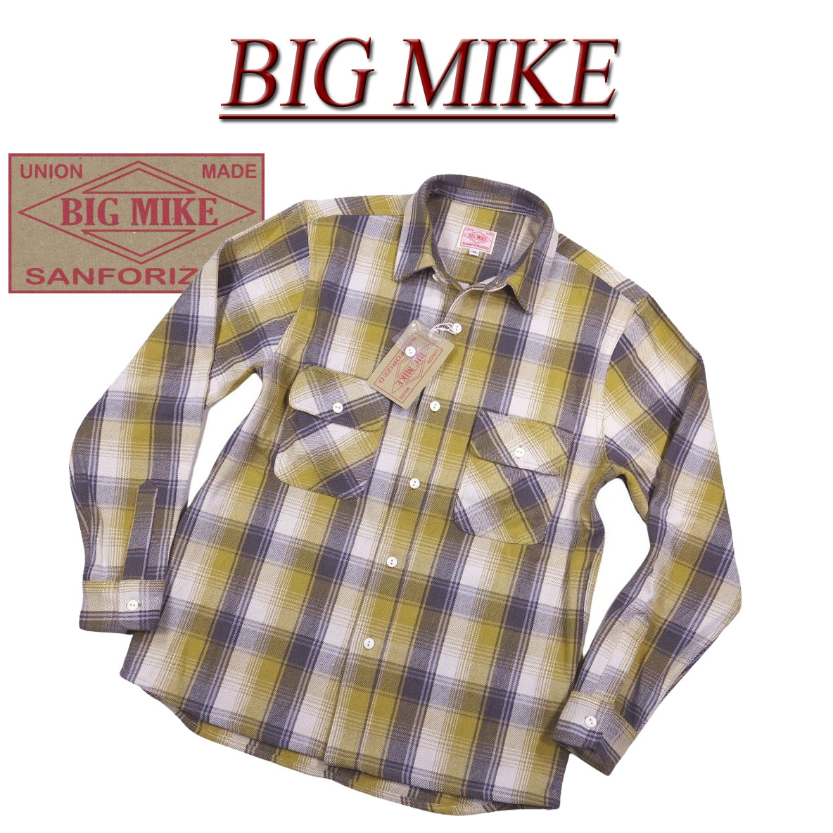 新品未使用 【BIG MIKE】復刻 長袖 チェック ヘビーネルシャツ 102535103 素材表示 コットン 100% コメント 新品未使用 【BIG MIKE】【ビッグマイク】【復刻】HEAVY FLANNEL WORK SHIRTS チェック 長袖 ヘビーネルシャツです!米国で100年以上も前に誕生した老舗ワークウエアブランドです。フランネルシャツ等、優れた製品を世に排出するも1980年代に姿を消すこととなった『BIG MIKE』を日本企画によって実名復刻したシリーズです!1950年代に用いられていたボックスタグを採用、タグの経年変化なども楽しみの1つです!負荷のかかる主要箇所は2本針でしっかりと縫製、フラップ付きボタン留めポケットが両胸に付きます!オールドテイストの猫目ボタンも良い雰囲気を醸し出しています!袖ボタンは袖口に1つ。袖口の開き部分もしっかりと補強されています!素朴で温かみのあるチェック柄(イエロー部分はもう少しマスタードより)。着込むほどに増していく色落ち感や風合いなど経年変化も楽しみです!生地の特徴である適度な粗さ(ネップ等)も良いアジとなっています。タフな素材感・絶妙な配色バランスなど老舗ならではの拘りの詰まった1品です!新品未使用 【BIG MIKE】復刻 長袖 チェック ヘビーネルシャツ 102535103 素材表示 コットン 100% コメント 新品未使用 【BIG MIKE】【ビッグマイク】【復刻】HEAVY FLANNEL WORK SHIRTS チェック 長袖 ヘビーネルシャツです!米国で100年以上も前に誕生した老舗ワークウエアブランドです。フランネルシャツ等、優れた製品を世に排出するも1980年代に姿を消すこととなった『BIG MIKE』を日本企画によって実名復刻したシリーズです!1950年代に用いられていたボックスタグを採用、タグの経年変化なども楽しみの1つです!負荷のかかる主要箇所は2本針でしっかりと縫製、フラップ付きボタン留めポケットが両胸に付きます!オールドテイストの猫目ボタンも良い雰囲気を醸し出しています!袖ボタンは袖口に1つ。袖口の開き部分もしっかりと補強されています!素朴で温かみのあるチェック柄(イエロー部分はもう少しマスタードより)。着込むほどに増していく色落ち感や風合いなど経年変化も楽しみです!生地の特徴である適度な粗さ(ネップ等)も良いアジとなっています。タフな素材感・絶妙な配色バランスなど老舗ならではの拘りの詰まった1品です! サイズ 肩幅 身幅 着丈 袖丈 M 45cm 52cm 72cm 61cm L 47cm 55cm 74cm 61cm XL 49cm 58cm 75cm 62cm XXL 52cm 60cm 78cm 64cm