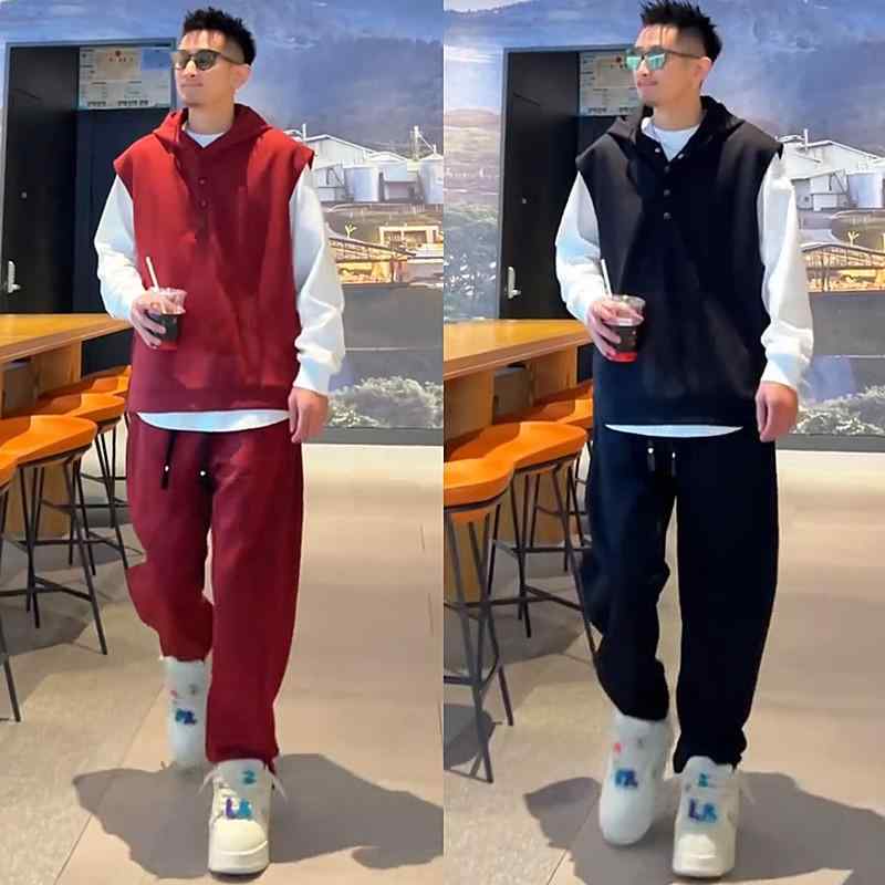 ・カテゴリ: メンズカジュアルセットアップ・スタイル: スポーツ・厚さ: 普通・主な素材: ポリエステル・パンツ丈: フルレングス・トップスタイプ: ベスト・トップス袖丈: 長袖・フード: あり・用途: カジュアル・カラー展開: アンコラレッド、ブラック・サイズ展開: M、L、XL、XXL、3XL