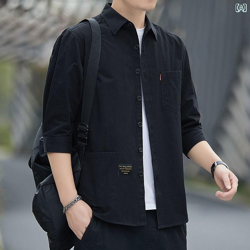 シャツ メンズ 七分袖 オープンカラー ゆったり ワーク トップス ジャケット 春夏 ポリエステル イージーケア 無地 薄手 トレンド 着回し ブラック ホワイト カーキ