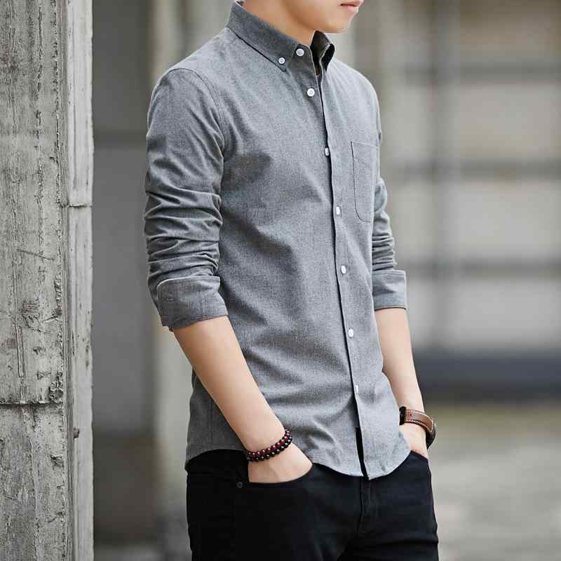 シャツ 男性用 長袖 オックスフォード 無地 スリムフィット カジュアル トップス 白 黒 紺 グレー 春秋