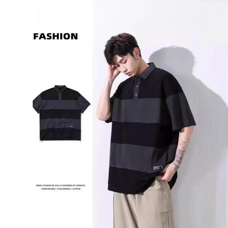 ポロシャツ メンズ 半袖 五分袖 襟付き ルーズフィット ストライプ柄 韓国 トレンド 切り替え 鹿の子 ポリエステル 春夏 普段使い ウォッシャブル 丈夫 イージーケア
