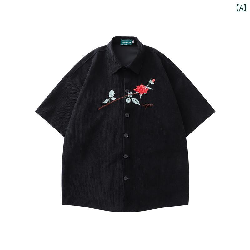 メンズ レディース おしゃれシャツ フラワー アメリカン レトロ ローズ 刺繍 半袖 シャツ 夏 コーデュロイシャツ ジャケット 薔薇 男女兼用